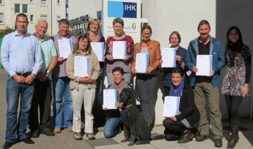 Wir gratulieren neun Absolventen des IHK-Zertifikatslehrgangs "Hundeverhaltenstherapeut, die ihr IHK-Zertifikat Hundeverhaltenstherapeut erhalten haben. Die Lehrinhalte umfassten sowohl fachspezifische als auch betriebswirtschaftliche Themen. Ethologie, Anatomie, Ausdrucks- und Lernverhalten des Hundes werden u.a. ebenso vertieft wie Existenzgründung und Unternehmensführung. Innerhalb der letzten Jahre nähert sich die Branche mehr und mehr einheitlichen Therapieansätzen, qualifizierten Therapiestandards und einem Codex zur gewaltfreien Erziehung des Hundes. Ziel des IHK-Zertifikatslehrgangs sind die Professionalisierung und Qualitätssicherung des bislang ungeschützten Berufsbildes „Hundeverhaltenstherapeut“. Hundebesitzern dient dieses entwickelte Qualitätsmerkmal zum Schutz vor selbsternannten Hundetrainern mit unzureichendem fachspezifischem Wissen. Nach einem kontrollierten Lehrgang und einem erfolgreich abgeschlossenen schriftlichen Test bestätigt das Zertifikat "Hundeverhalten therapeut (IHK)" die Kompetenz und die anspruchsvolle Verpflichtung der Hundeverhaltenstherapeuten (IHK), die sich formal nur in Verbindung mit diesem Zertifikat als Solche benennen dürfen. Ausführliche Informationen finden Sie unter dem Menüpunkt Fortbildungen.